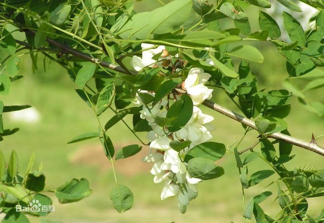 刺槐樹(shù)皮厚,暗色,紋裂多,樹(shù)葉根部有一對1~2mm長(cháng)的刺,花為白色,有香味,穗狀花序。